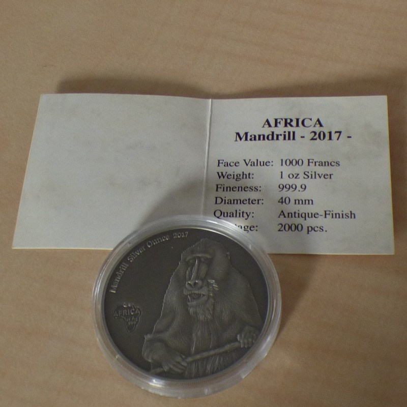 Cameroun 1000 CFA 2017 Mandrill antique finish silver 99.9% 1 oz + CoA