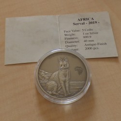 Ghana 5 Cedis 2019 Serval silver 99.9% 1 oz antique +CoA