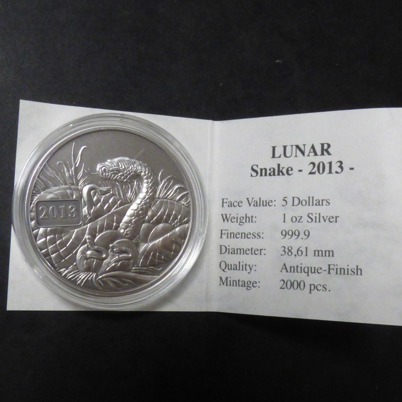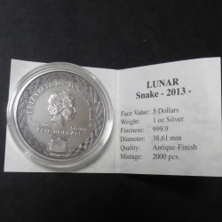 Tokelau 5$ 2013 Snake antique finish silver 99.9% 1 oz + CoA