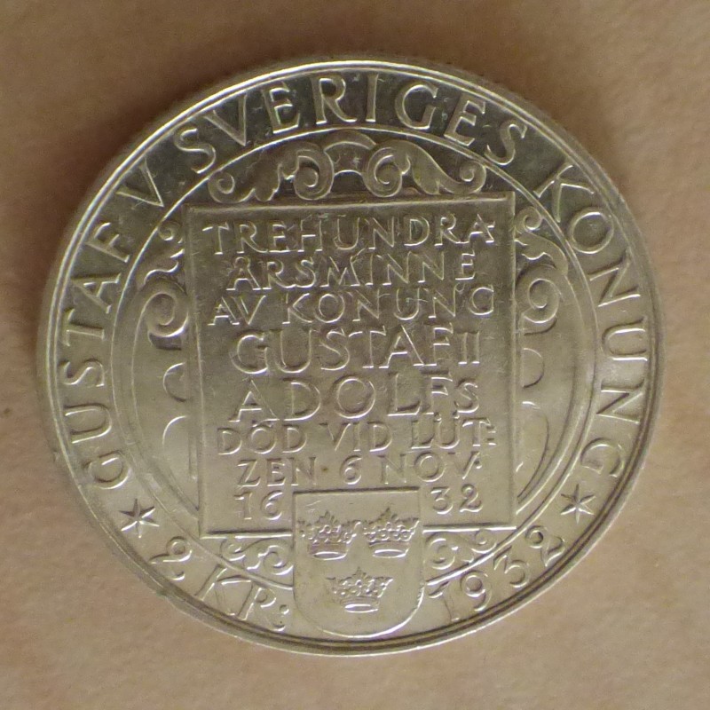 Sweden 2 Kronor Gustaf V 1932 Death of Gutsaf II silver 80% 15g EF