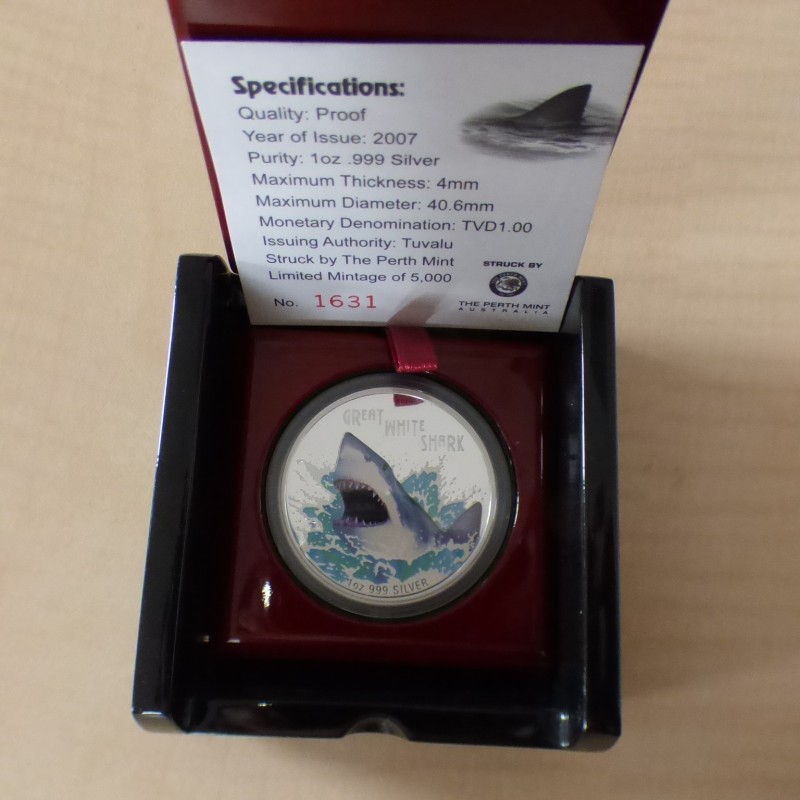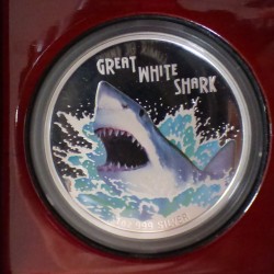 Tuvalu 1$ 2007 Great White Shark PROOF colored silver 99.9% 1 oz