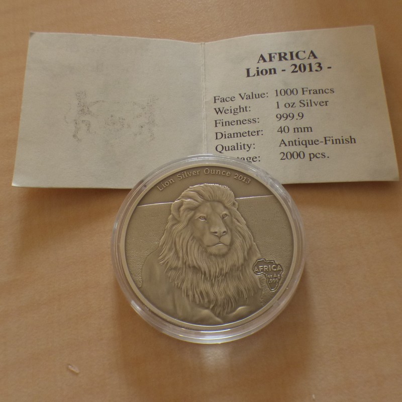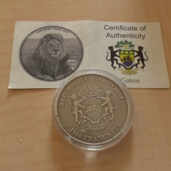 Gabon 1000 CFA Lion 2013 antique finish en argent 99.9% 1 oz + CoA
