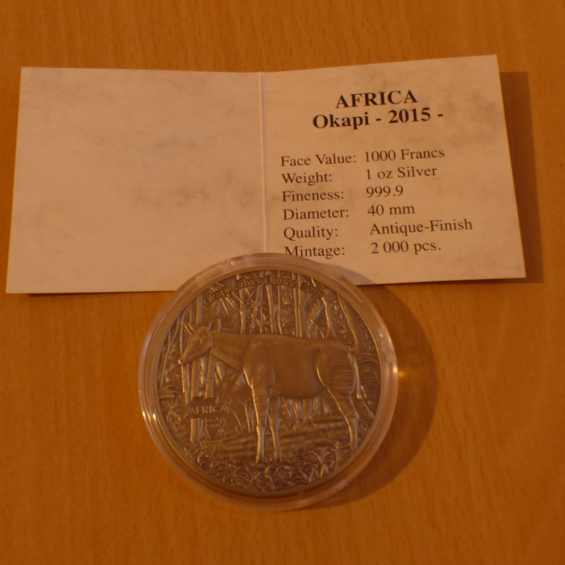 Congo 1000 CFA 2015 Okapi antique finish argent 99.9% 1 oz