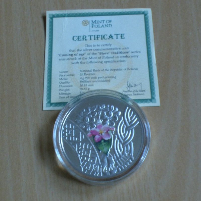Bielorussie 20 roubles 2010 Traditions PROOF coloré en argent 92.5% 1 oz + CoA