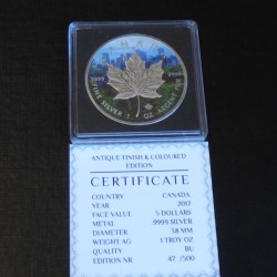 Canada Maple Leaf 2017 antique finish colorée argent 99.9% 1 oz + CoA