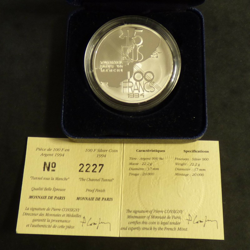 France 100 francs 1994 Tunnel sous la Manche PROOF argent 90% (22.2 g)+CoA+Boite