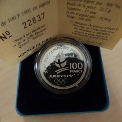 France 100 Francs 1991 JO Albertville PROOF Saut à Ski argent 90% (22.2 g)+Boite+CoA