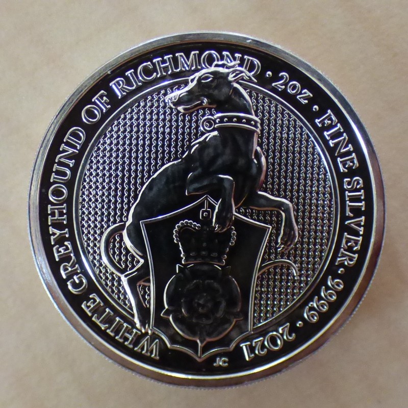 UK 5£ Queen's Beasts Lévrier de Richmond 2021 en argent 99.9% 2 oz